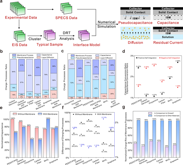 团队进一步研究发现,在不同过电位条件下,电荷存储过程中的对称性与电容转化率存在关联;离子选择性膜的存在会限制不同材料的电容性能,导致工作状态下转导层界面电容与无膜修饰电极电容存在显著差异。该研究表明在固体转导层材料开发中,不仅需要关注高疏水与大电容特性,也要重视材料与离子选择性膜之间的相互作用,应使电荷存储过程在不同极性过电位下保持相对均衡,同时需考虑离子选择性膜对转导层材料充放电过程的制约程度。该研究基于电极界面动力学原理为设计转导层材料提供了新策略,可作为跨电化学领域的普适性策略。